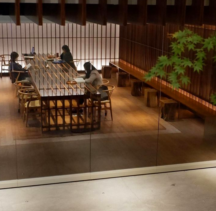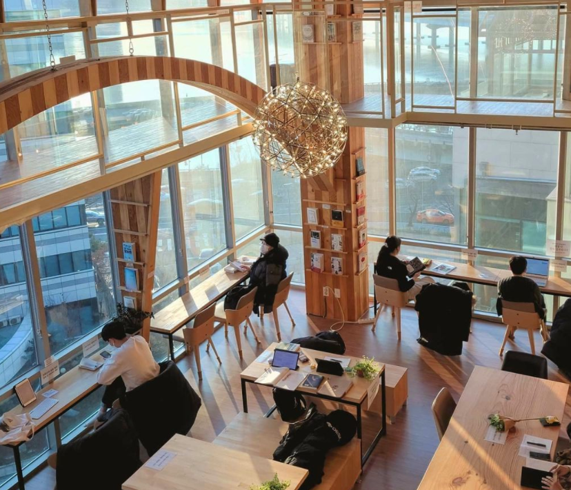 건물 8,9층에 위치해 있어서 위에서 내려다보는 뷰와 통유리와 복층 구조로 이루어져 있어 층고가 높아서 개방된 느낌을 주어서 좋은 것 같네요. 이곳은 신발을 벗고 들어가야 하는 구조라서 집에서 책을 읽는 것 같아서 더 맘이 편해지는 것 같네요.