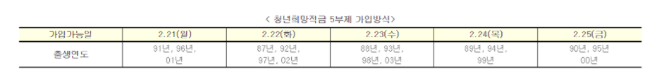 신청자는 1개 은행을 통해 1개의 계좌만 개설을 할 수 있습니다. 출시한 첫 주에는 신청자가 몰리는 것을 대비해서 5부제 가입방식이 적용이 됩니다. 5부제 가입 방식은 다음과 같습니다.