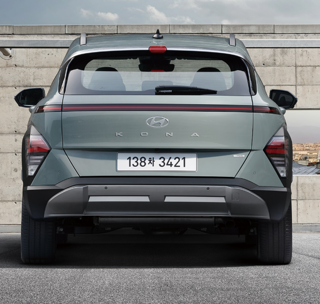 코나는 현대자동차의 최신 디자인 언어를 반영하여 미래지향적이고 세련된 외관을 자랑합니다. 전면부는 휠 하우스 클래딩이 헤드램프와 이어지는 '아머(Armor)' 디자인을 채택하여 강인한 인상을 주며, Full LED 헤드램프(프로젝션 타입)가 적용되어 야간 주행 시 우수한 시야를 확보합니다.
