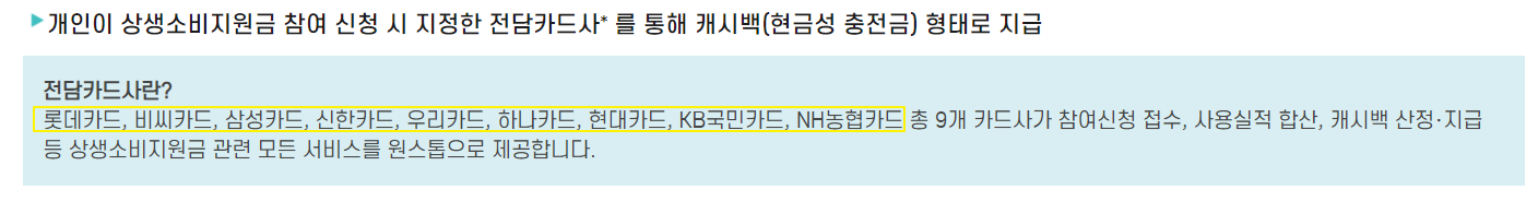 위의 9개의 전담카드사에서 신청이 가능하고 신청방법은 각각의 카드사 홈페이지나 어플리케이션에 접속하면 제일 처음 이와 관련된 팝업창이 뜨게 됩니다. 이를 누르고 접속하여 안내대로 신청을 하면 참여가 완료가 됩니다.