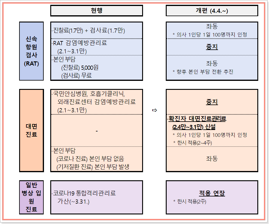 4월 4일부터 코로나 환자를 대면진료할때 관리료 1인당 24,000원에서 31,000원까지 지원됩니다. 즉, 내가 코로나 확진 대면진료를 받게 될 때 건강보험공단에서 지원해 주는 금액이기 때문에 본인 부담금이 없게 됩니다.
