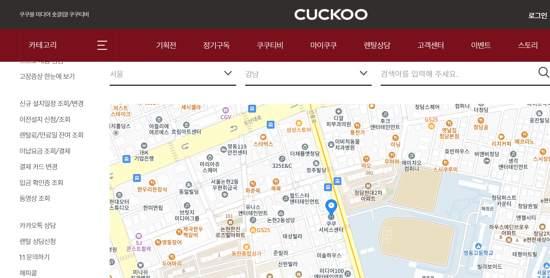 위의 화면이 보이시면 본인이 거주하는 시와 구 등을 입력하면 가장 가까운 쿠쿠정수기 서비스센터를 발견하실 수 있습니다.
