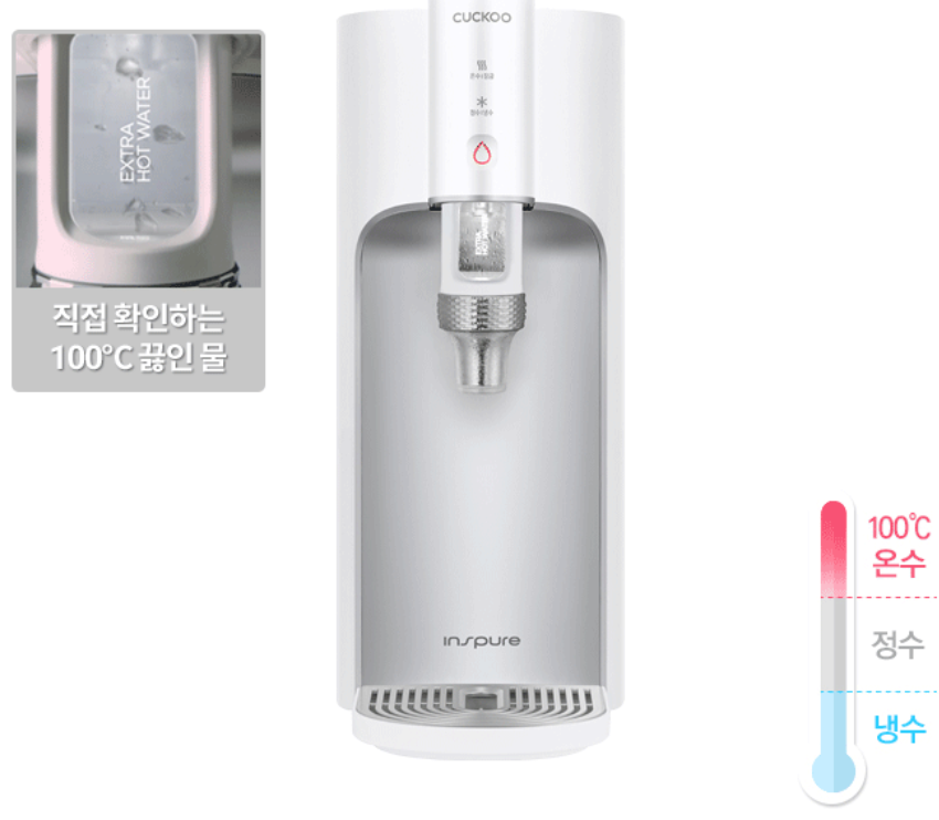 쿠쿠 정수기 렌탈 인앤아웃 정수기는 100도를 끓인 것을 직접 눈으로 확인을 할 수 있는 시스템입니다.