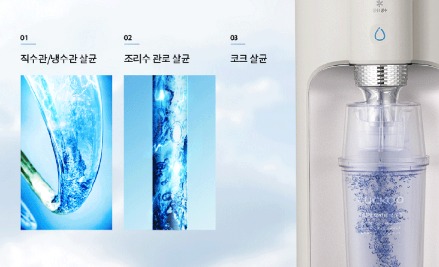 외부와 접촉하는 코크 및 관로, 냉수관까지 깨끗하게 전기분해 살균할 수 있습니다.