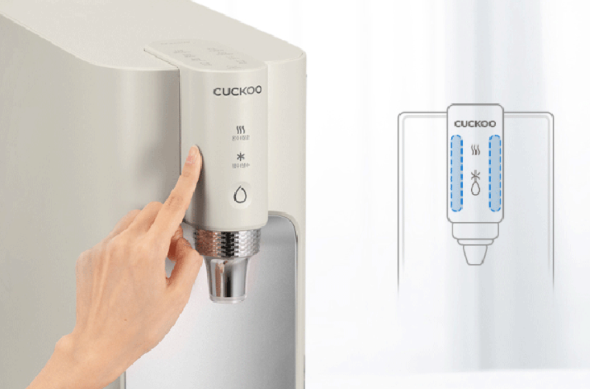다른 화학물질이나 외부물질 없이 정수기에 들어오는 원수로만 전체 관을 살균할 수 있는 시스템인 ‘인앤아웃 살균 시스템’을 탑재하고 있습니다. 예약시간을 설정하거나, 소비자가 원할 때마다 언제든지 버튼 하나만 누르면 자동으로 살균됩니다. 물이 닿는 내부 관로부터 냉수관, 외부 코크까지 모두 살균할 수 있고, 살균 후에는 세척수로 추가로 씻어내 미생물과 물때를 완벽히 제거합니다.