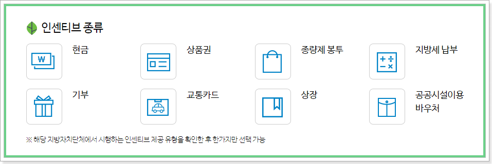 인센티브 종류는 지방자치단체에서 시행하는 인센티브 제공 유형을 미리 확인해서 한 가지만 선택이 가능하기 때문에 이는 해당 지방자치단체에 문의를 해보시는 것이 좋습니다.