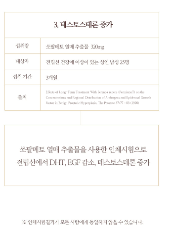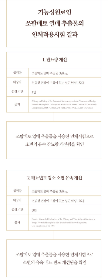 트루포뮬러에는 전립선에 도움을 주는 쏘팔메토라는 성분이 함유되어 있습니다. 이 성분은 역시 잔료량 개선에 효능이 있는데요. 실제로 전립선이 문제가 있는 성인 남성을 대상으로 일정 기간 동안 쏘팔메토 추출물을 섭취하게 한 결과 인체시험으로 소변의 유속 잔뇨량이 개선되는 것을 확인한 연구 결과가 있습니다.
