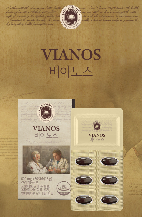 트루포뮬러 비아노스의 주원료는 쏘팔메토 추출물을 비롯한 옥타코사놀과 비타민 E, 비타민B, 아연 등이 있고 부원료로써는 오미자 농축분말, 마카추출농축액분말, 마늘엑기스 분말, 홍삼 농축액 분말, 당귀 추출분말, 강황 추출분말, 아르기닌 등이 함유되어 있습니다.