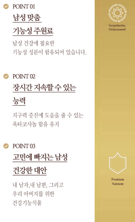트루포뮬러 비아노스에 함유된 옥타코사놀은 전립선에 이상이 생겼을 때 발생하는 지구력 저하를 막는데 도움을 주고 있는데요. 더 나아가 지구력 증가의 효과를 볼 수 있습니다.