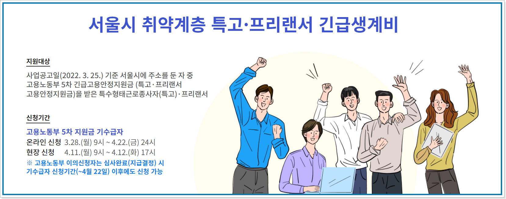 코로나로 인해 지속적인 생계 위기를 겪고 있는 특고프리랜서에게 긴급생계비를 지급하는데요. 서울시에서 지원하는 지원금이니 서울시민이 대상이 되겠습니다. 사업공고가 난 2022년 3월 25일을 기점으로 서울시에 주소지를 둔 사람 중에서 고용노동부의 5차 긴급고용안정지원금 (신규수급자 100만원, 기존수급자 50만원)을 수급한 자입니다.