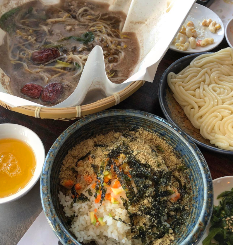 소쿠리안에 유산지가 깔려있고 그 위로 야채들이 쌓여 있으며 육수를 부어서 상에서 바로 끓여서 먹는 방식인데요. 육수를 부으면 보글보글 혼자서 잘 끓는 신기한 경험을 할 수 있는 메뉴입니다. 정갈한 반찬들과 함께 나오는 한우 샤브샤브는 이곳이 원래 한우 전문점이라 그런지 고기 맛도 일품이랍니다.