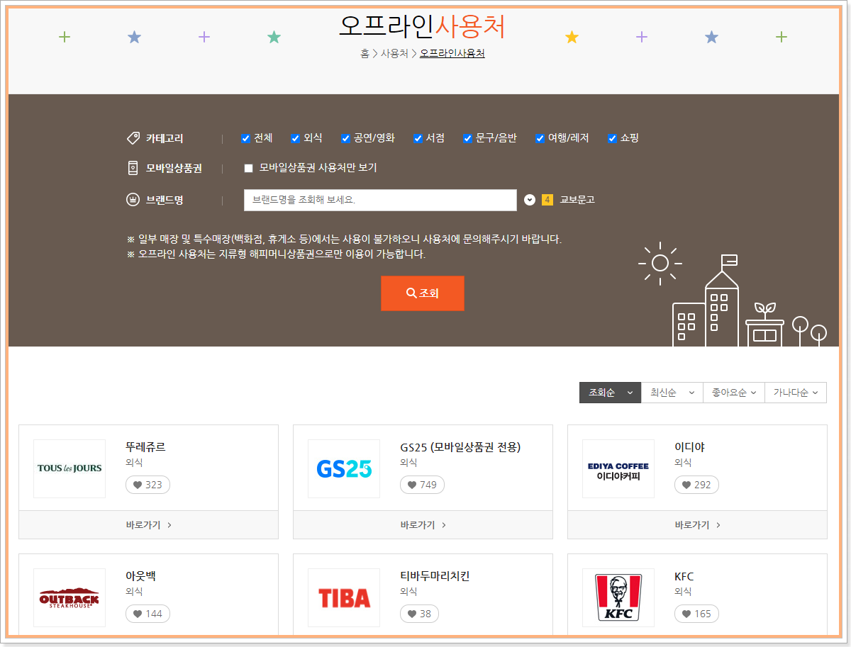 다음은 해피머니 상품권 오프라인 사용처입니다. 오프라인 사용처도 마찬가지로 직접 해당 카테고리를 검색해보시면 원하시는 곳에서 해피머니 상품권을 사용할 수 있는지 검색해 보실 수 있습니다. 오프라인 사용처는 총 555개의 사용처를 확인하실 수 있습니다.