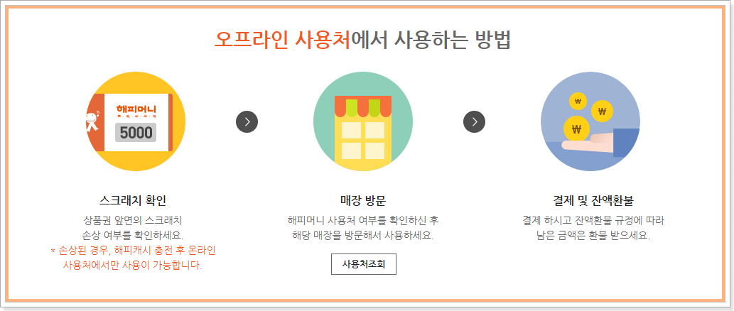 해피머니상품권은 화폐와 같은 형태로 발행되는 종이형 실물 상품권으로 오프라인 사용처에서 사용하거나 해피캐쉬로 충전을 해서 온라인에서 사용할 수 있는 국내 최초 온/오프라인 통합상품권입니다.