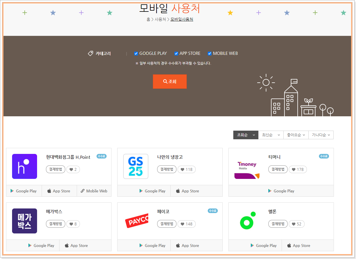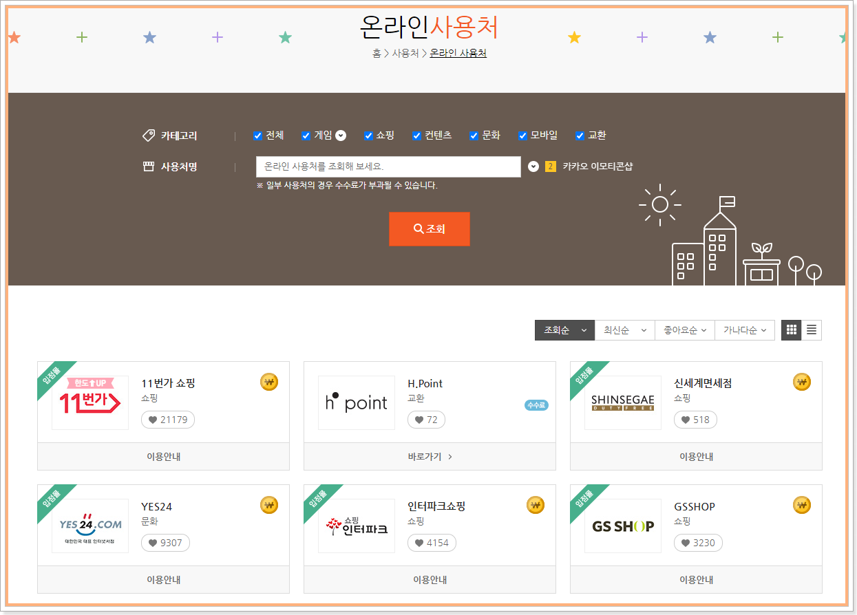 아래에 사용처는 일부에 불과하고 직접 검색을 해보시면 더 많은 사용처를 아실 수 있습니다. 총 119개의 온라인사용처를 확인하실 수 있습니다.
