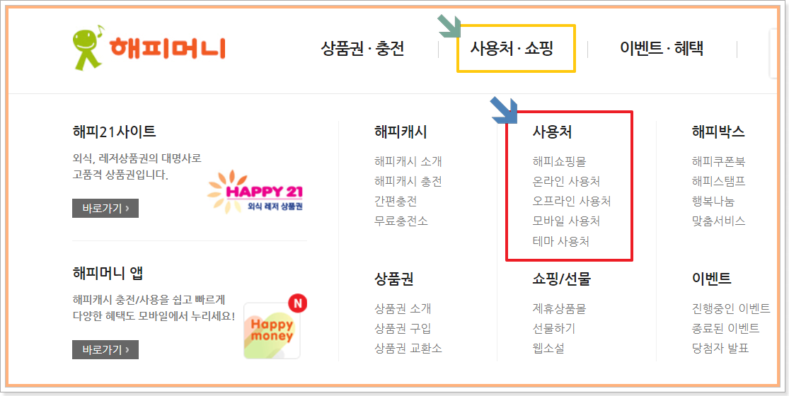해피머니상품권 사용처는 해피머니 공식 홈페이지로 들어가셔서 사용처, 쇼핑을 클릭하시면 사용처에서 검색을 해볼 수 있습니다. 온라인, 오프라인, 모바일 등 상품권 종류별로 사용처를 알아보실 수 있습니다.