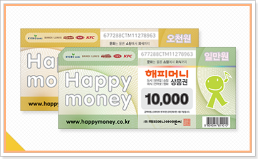 해피머니상품권은 화폐와 같은 형태로 발행되는 종이형 실물 상품권으로 오프라인 사용처에서 사용하거나 해피캐쉬로 충전을 해서 온라인에서 사용할 수 있는 국내 최초 온/오프라인 통합상품권입니다.