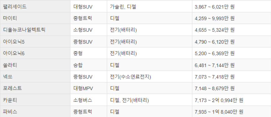 이 정도의 차들을 최소 1000만 원에서 구입이 가능합니다. 물론 아반떼나 포터의 경우는 옵션에 따라서 더 많이 비싸지기도 하는데요. 가장 저렴한 현대자동차 종류라고 하면 위와 같습니다.