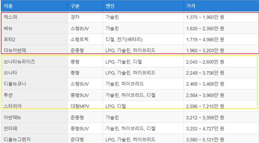 현대자동차 대표적인 차 종류는 우선 경차, 세단, SUV 이렇게 나뉠 수 있습니다. 각 종류마다 가격이 물론 다는데요.