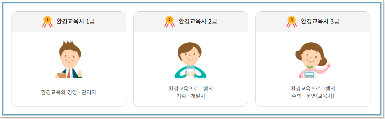우선 3급은 환경교육프로그램의 수행과 운영을 맡게 되고, 2급은 환경교육프로그램의 기획 및 개발을, 마지막 가장 높은 단계인 1급은 환경교육의 경영, 관리를 하게 됩니다.